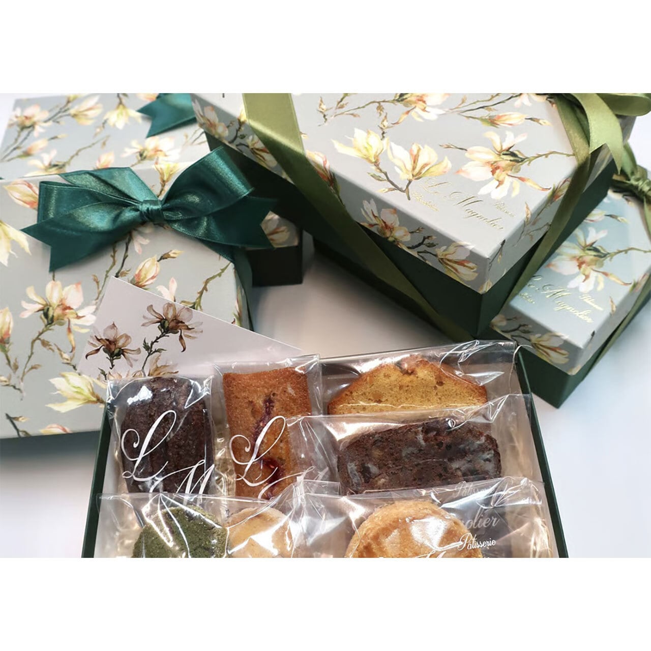 箱の中には、マグノリアで人気のフィナンシェやマドレーヌ、サブレ、パウンドケーキなど、パティシエがその時々で一番おすすめしたい焼き菓子をセレクトし、6個から7個詰め合わせています。