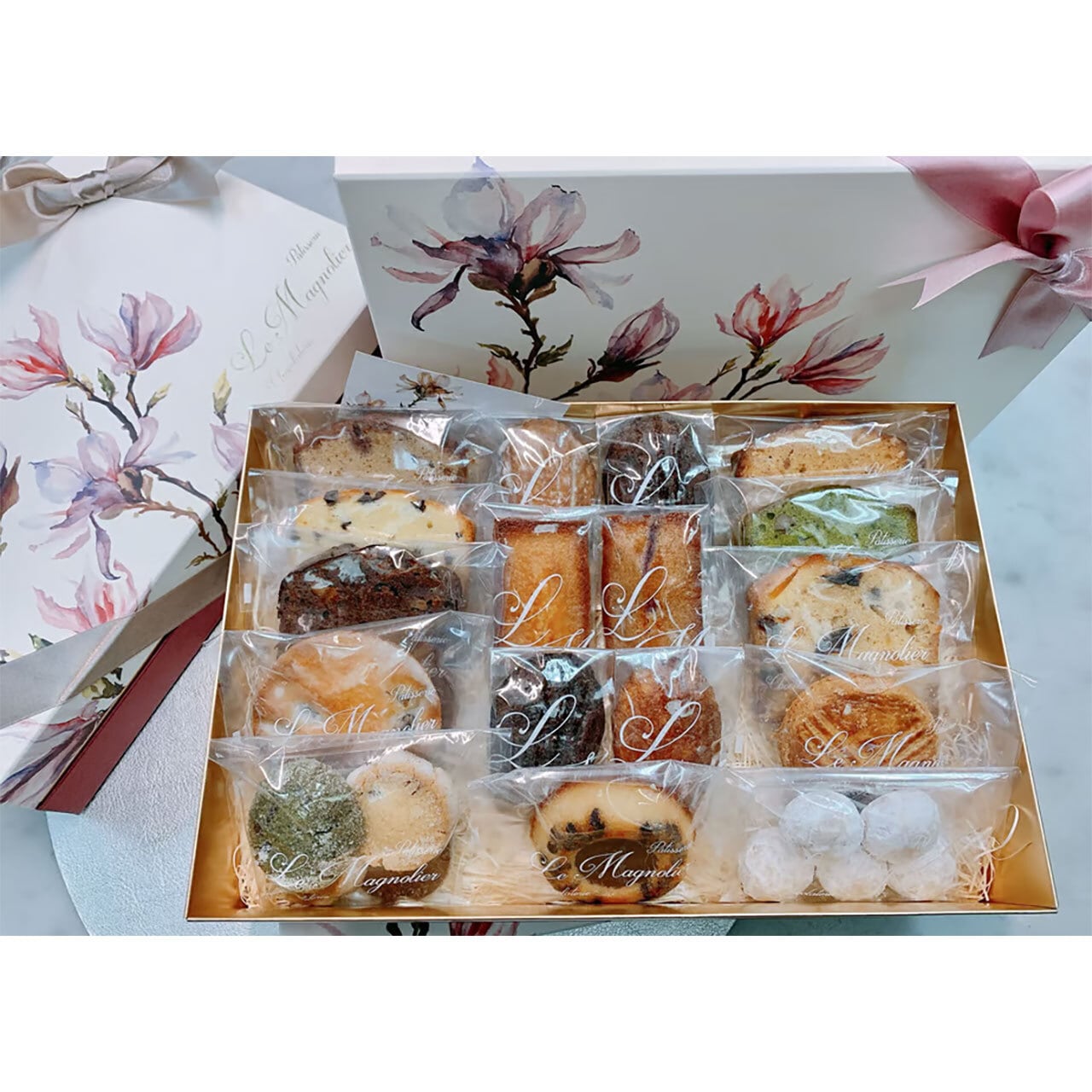 そんな想いを、マグノリアの花をあしらった愛らしいデザインの箱に詰め込みました。