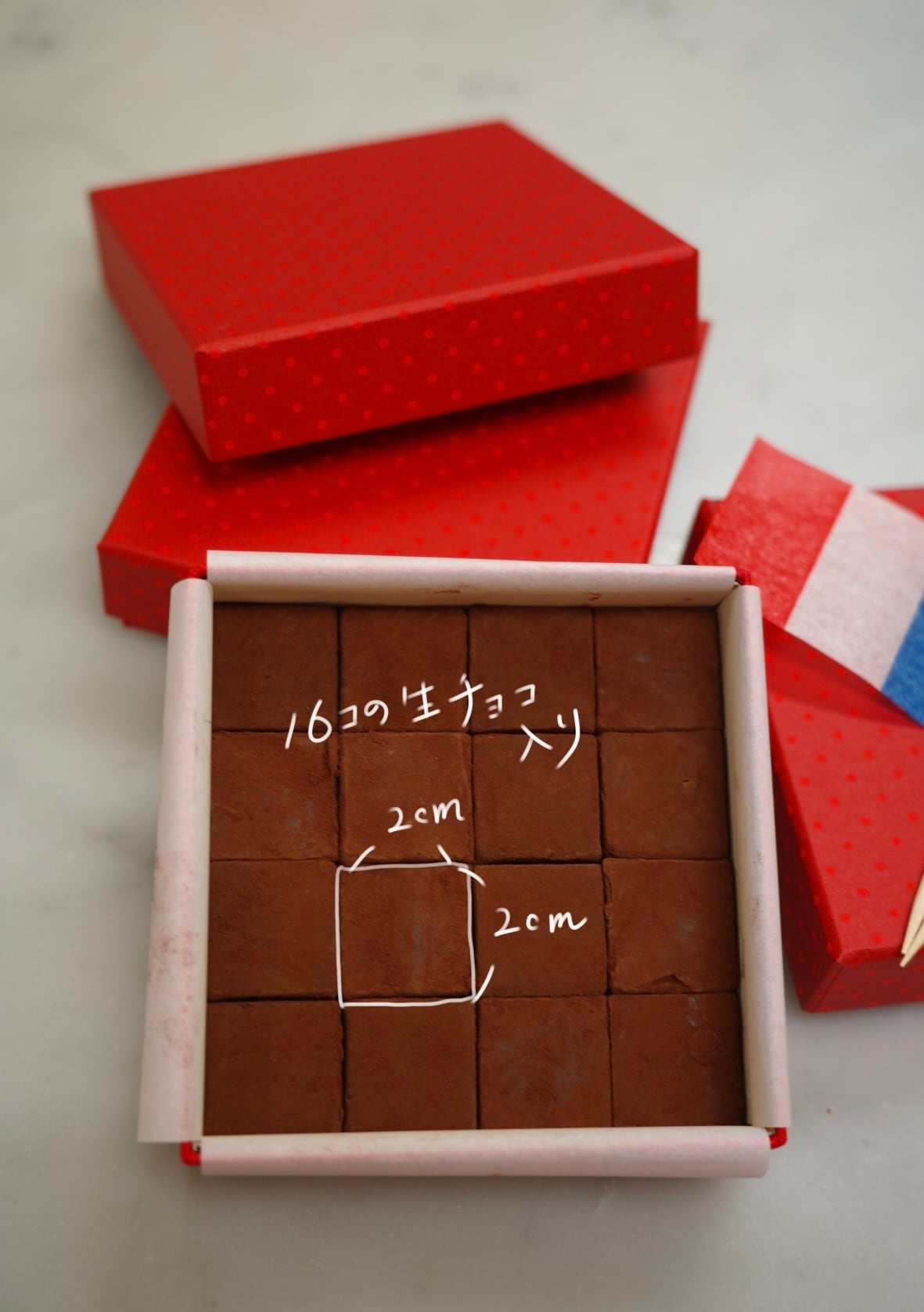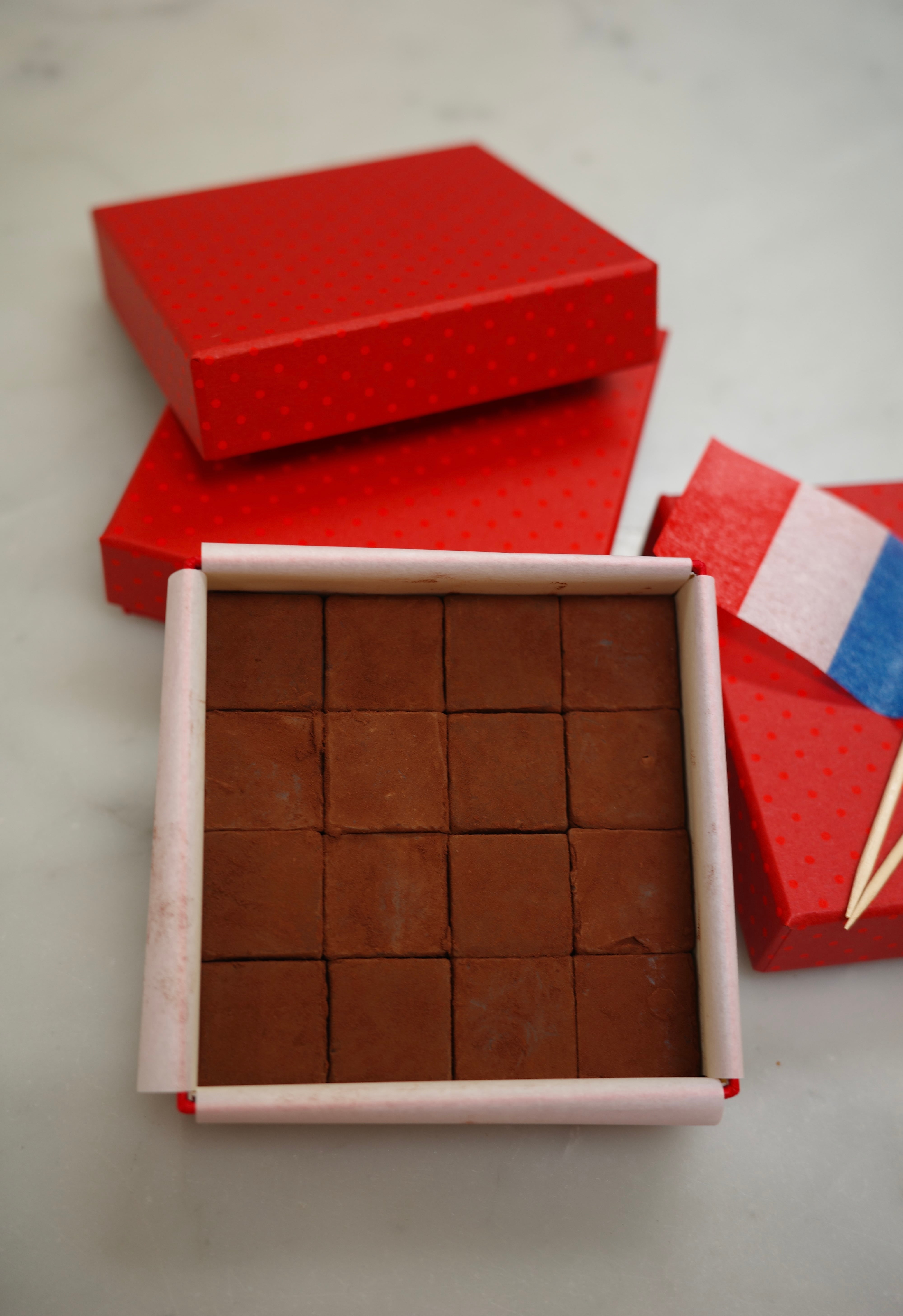 2cm×2cmの可愛らしいサイズの生チョコが16粒ぎゅっと詰まった小さなギフトボックスです。お口に入れるとチョコレートの香りがフワッと広がり、とろりと溶け出します。甘すぎず、食べやすいよう工夫しノンアルコールで仕上げています。きっと16粒あっという間になくなってしまうのでは・・・ぜひギフトにもどうぞ!