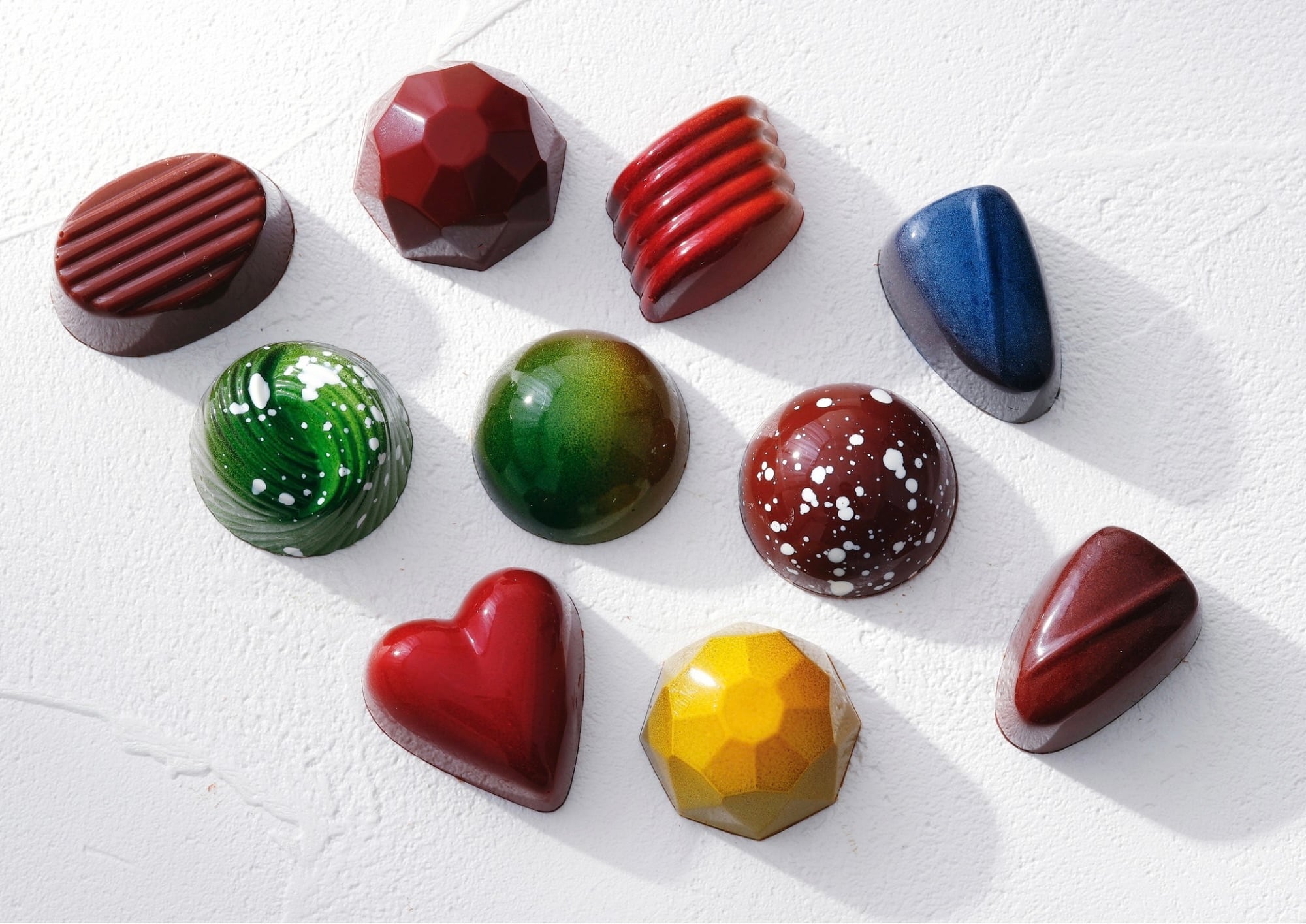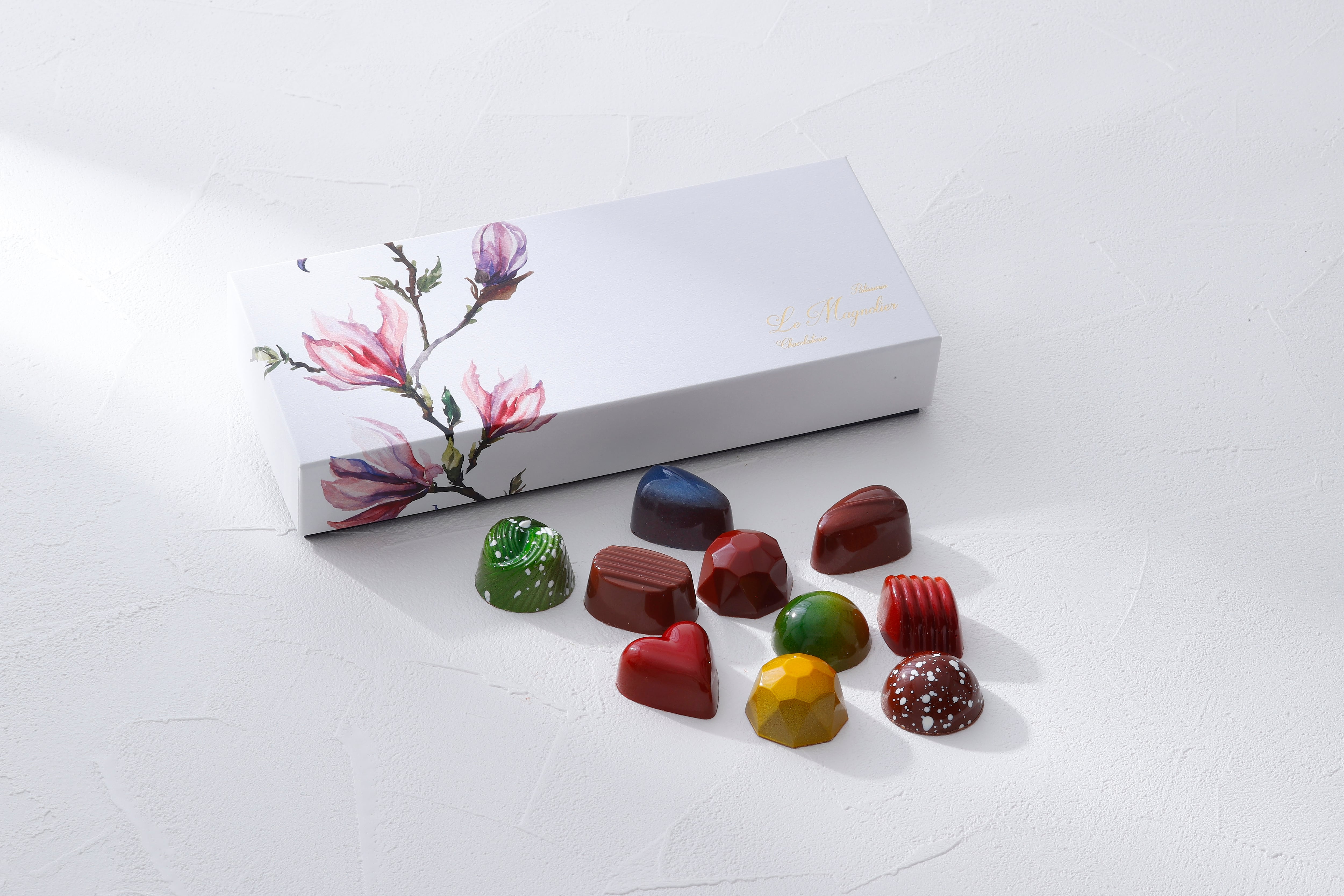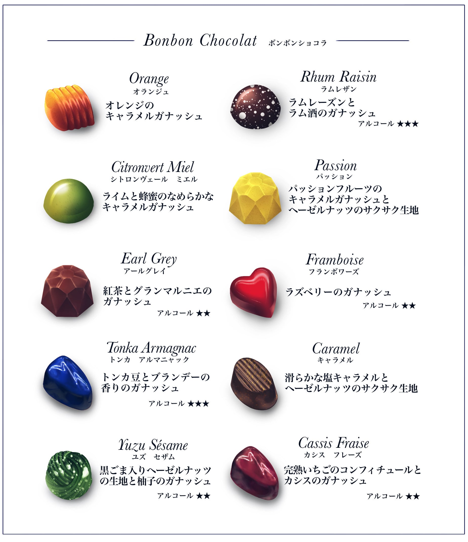 職人が1粒1粒丹精込めて作った、当店イチオシのショコラです。お味は全部で10種。薄いチョコレートの中には、コンフィチュールやガナッシュ、ナッツや生地のサクサクが忍んでいます。カリッと噛むとその個性豊かな10種それぞれの魅力がとろけます。こちらは冬季限定で、特にシェフが強くおすすめする商品です。美しい艶と一緒に、どうぞその風味をお楽しみいただけたら幸いです。